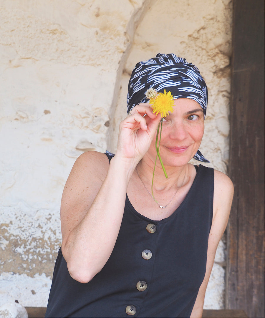 Bring some positivity and tropical vibes with this chemo headwear scarf-like with short side ties in our tropical print! The colorful print is sure to bring a smile to your face and lift your spirits, even on the toughest days. Whether you're resting at home or heading out to your next treatment, this headwear is the perfect way for when you want a ready-to-wear accessory, it won't take you more than 5 seconds! You will be wearing it because a Pre-Tied Knot style. Its front braiding will also give you volume. Different prints available