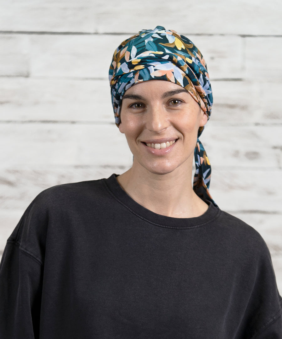 Chemo headwear scarf-like with short side ties in a tropical print. Perfect for when you want a ready-to-use accessory, it won't take you more than 5 seconds! You will be wearing it because a Pre-Tied Knot style. Its front braiding will also give you volume. Different prints available